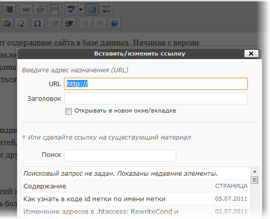 Если в визуальном редакторе щелкнуть на кнопке добавления/изменения ссылки (она активна, когда выделен текст), открывается окно, в котором теперь появилась новая возможность, скрытая за словами