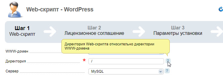 Директория по умолчанию корневая ( / ) , т.е. WordPress устанавливается в корневую директорию заданного www-домена.