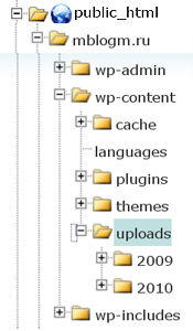 WordPress создаст папку uploads автоматически, но для этого необходимо задать для папки wp-content вашего блога WordPress права доступа 777 (через CPanel или через FTP-клиент). Когда папка uploads уже создана, в целях безопасности нужно назначить для папки wp-content более ограничивающие права доступа (Changing File Permissions).